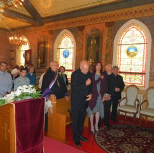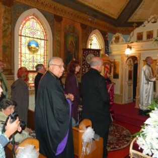 On Saturday morning, October 8th Holy Liturgy was celebrated and we were blessed to have His Grace Bishop Mitrophan of Canada, join us as well. During the Small Entrance, His Grace Bishop Irinej elevated the parish priest Borjan Vitanov to the rank of protonamesnik (oikonomos, οἰκονόμος). After receiving the Holy Communion there was a blessing of the Kolac (festal bread) and Koljivo (boiled wheat) in honor of the celebration of the Patronal Feast Day, the Renewal of the Temple of the Resurrection in Jerusalem. Among the present we were happy to have the local Roman Catholic Priest and Lutheran pastors neighboring our Parish with some of their flock. At the conclusion of the Liturgy, Bishop Irinej gifted the parish with a silver and enamel hand cross as a sign of his affection and paternal love.